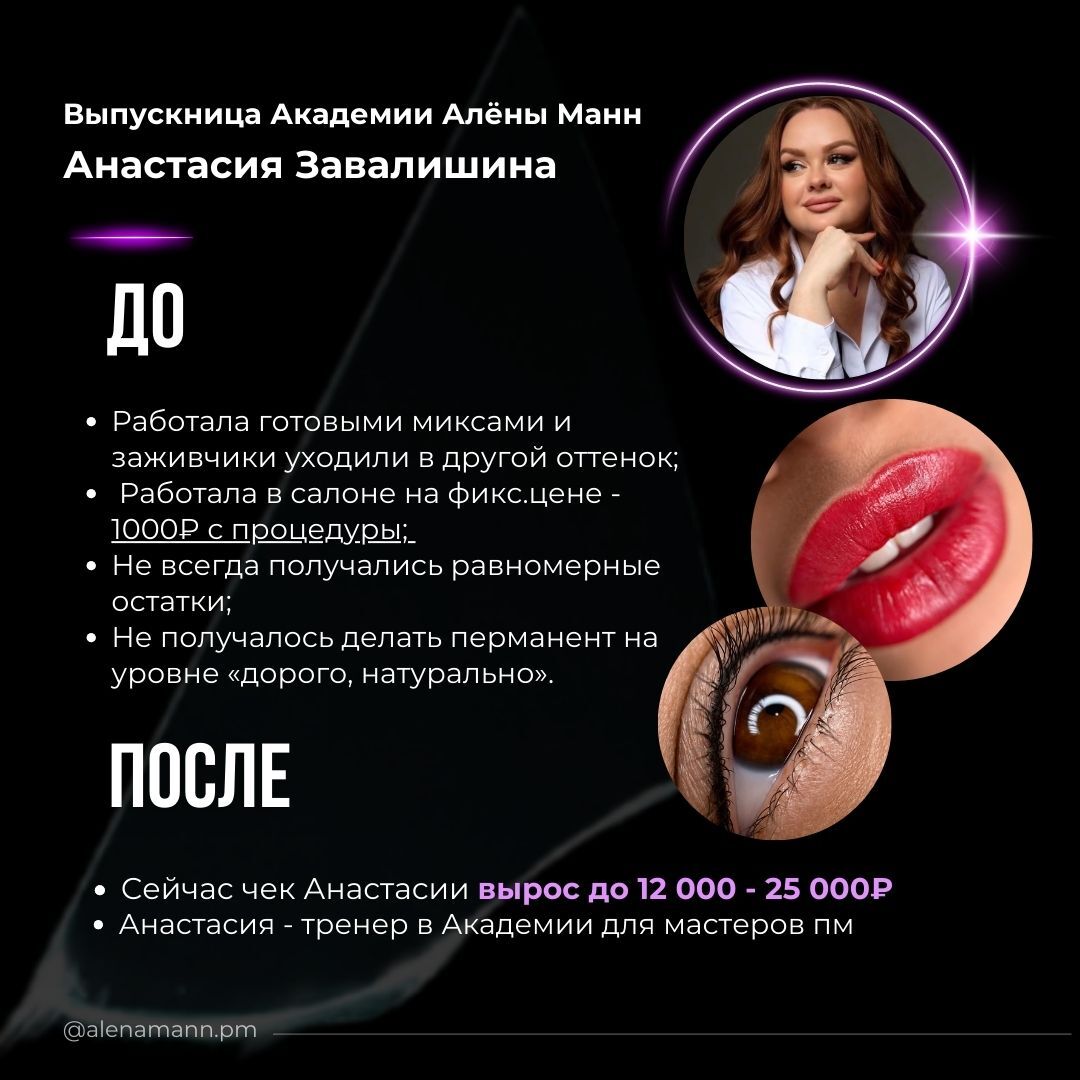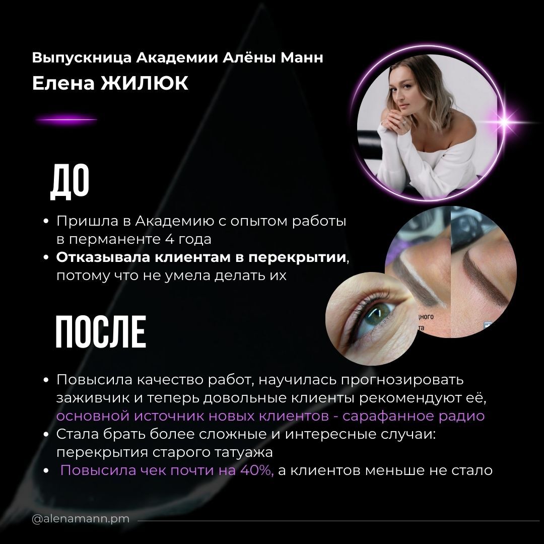 Когда вы добавите услугу перекрытия в свой прайс, вы выйдете из ниши мастеров-середнячков в ЛИГУ БОГАТЫХ МАСТЕРОВ и получите такие же результаты, как у меня и моих выпускников. Некоторые из них увеличивают свой доход в 25 раз!