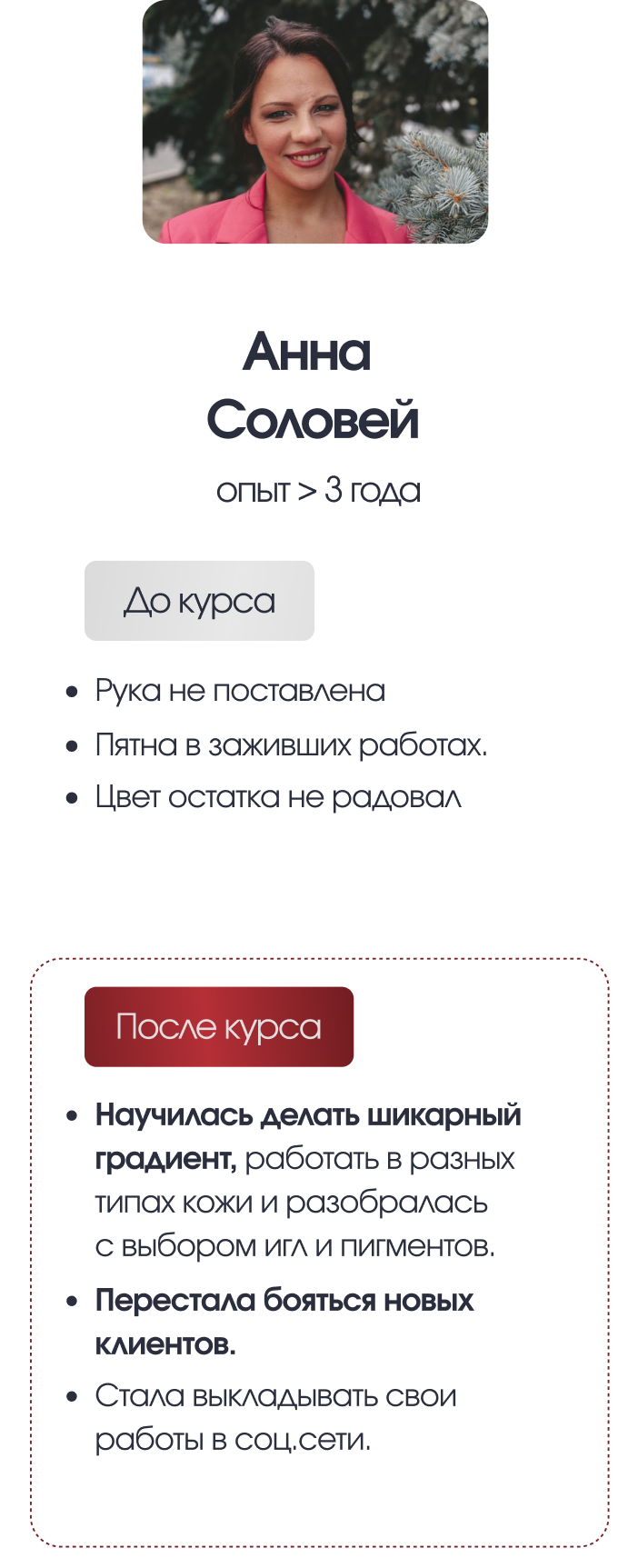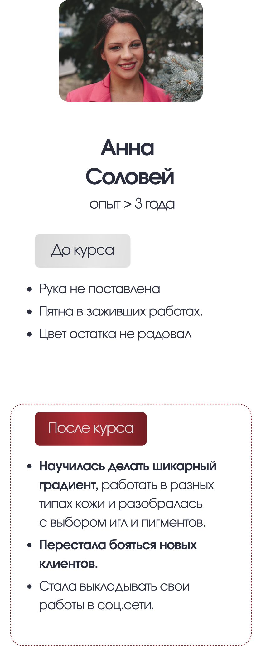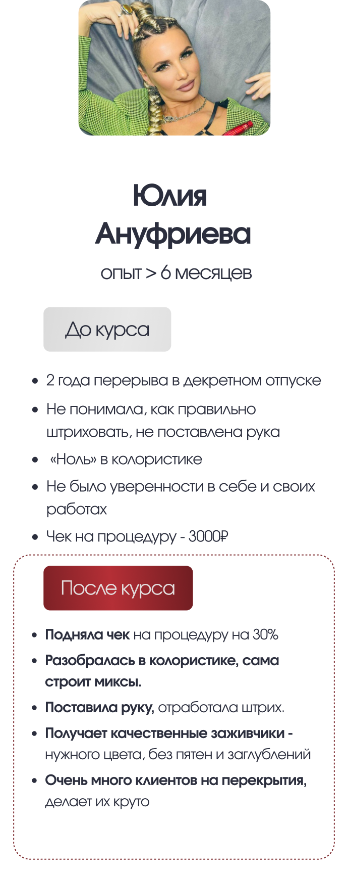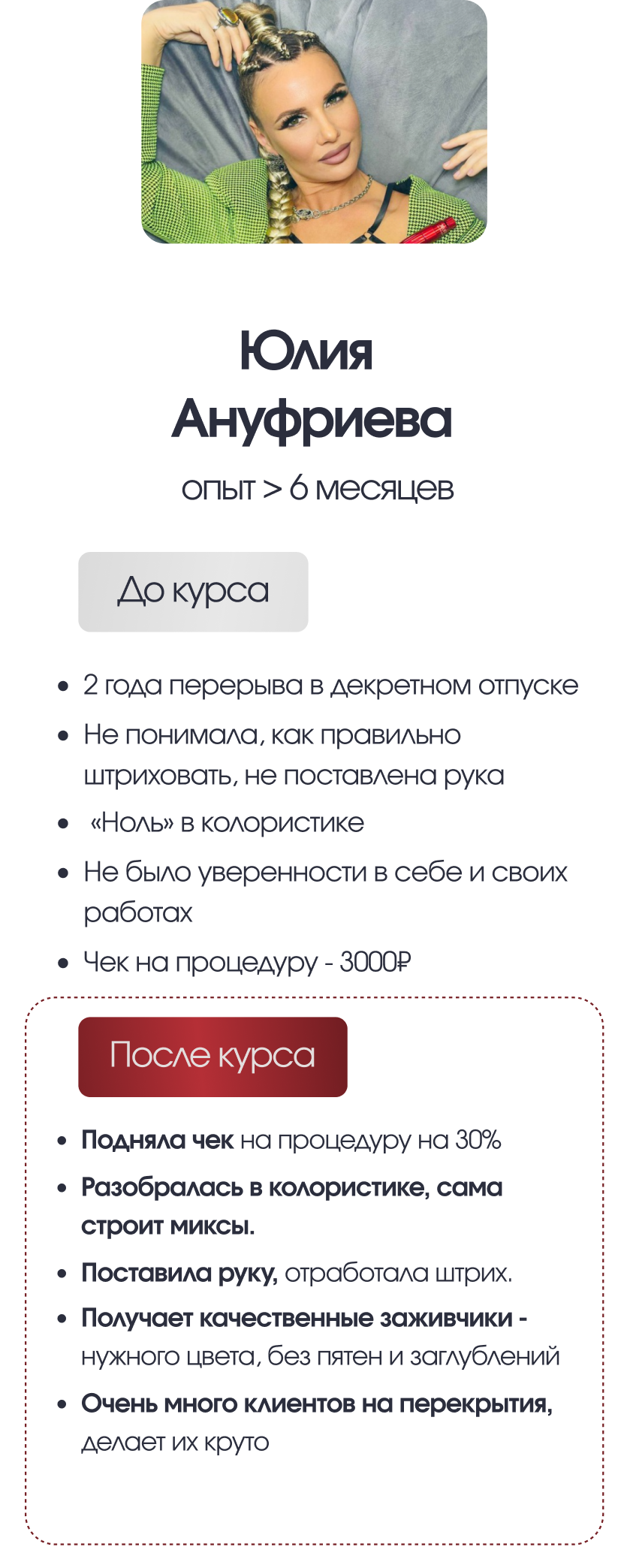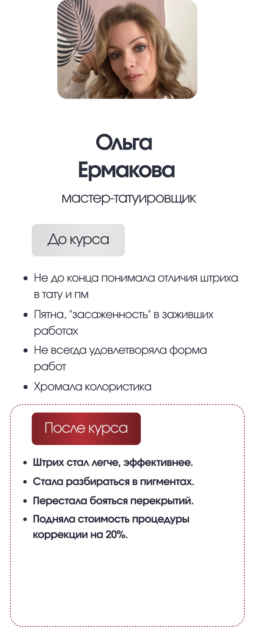 И тогда я поняла, что мне нужен четкий проверенный алгоритм: как проводить процедуру от начала до конца, правильно подбирать формы/аппарат/иглу/пигмент/, чтобы работы были качественными и я чувствовала себя уверенно.